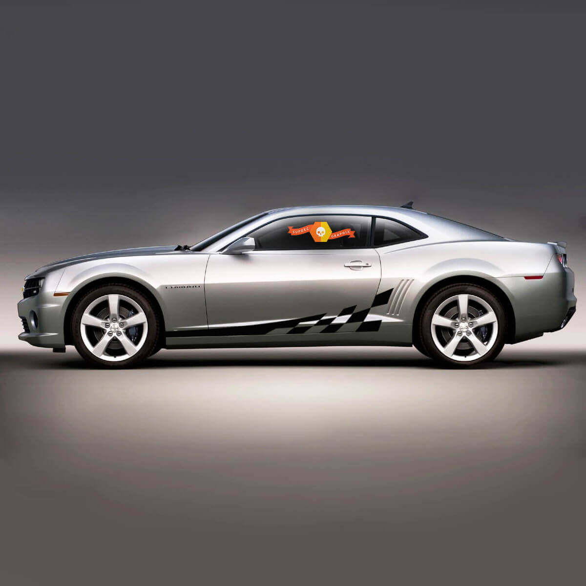 Enhance your Chevrolet Camaro (2010-2015) with our high-quality checkered rocker panel side vinyl stripes. Designed specifically for a perfect fit, these decals add a sporty and eye-catching look to your car’s exterior.