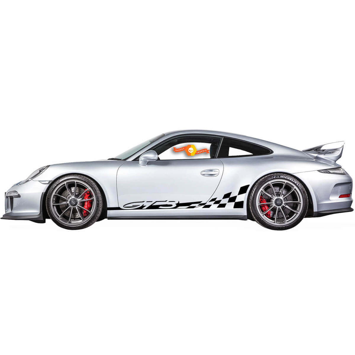 Enhance your Porsche 911 GT3 with our Checkered Side Stripes Kit Decal Sticker. Specifically designed to fit the sleek lines of your car, these vinyl decals add a sporty and unique checkered pattern, perfect for car enthusiasts seeking a bold look.