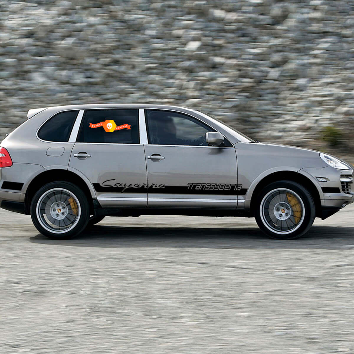 Enhance your Porsche Cayenne's look with the New Transsyberian Side Stripes Kit Decal Sticker. Designed for a perfect fit, this high-quality vinyl decal adds a sleek, sporty touch to your vehicle’s side profile.